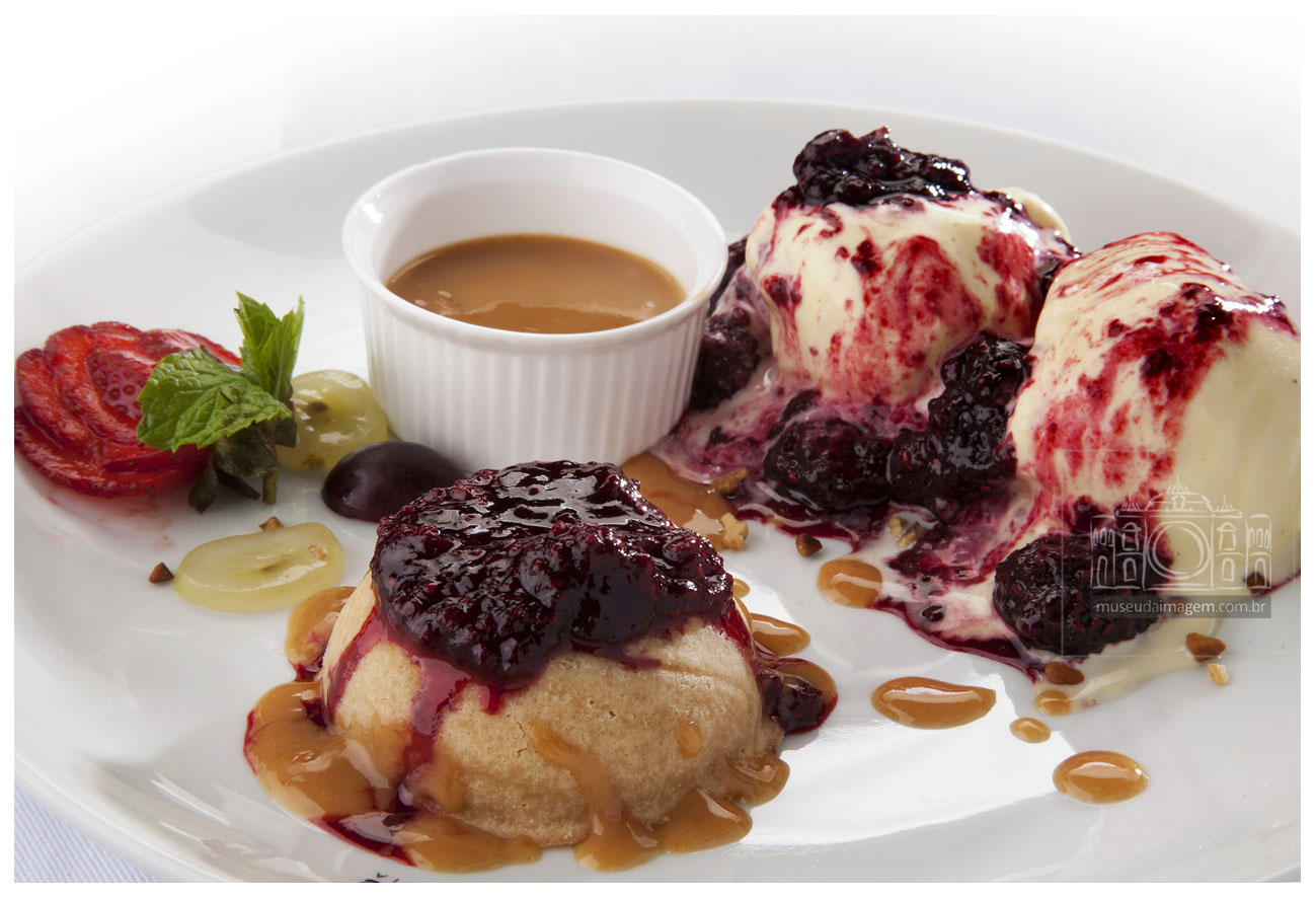 Petit Gateau de Doce de Leite-Gateau com recheio de doce de leite, calda de frutas vermelhas e sorvete de creme.