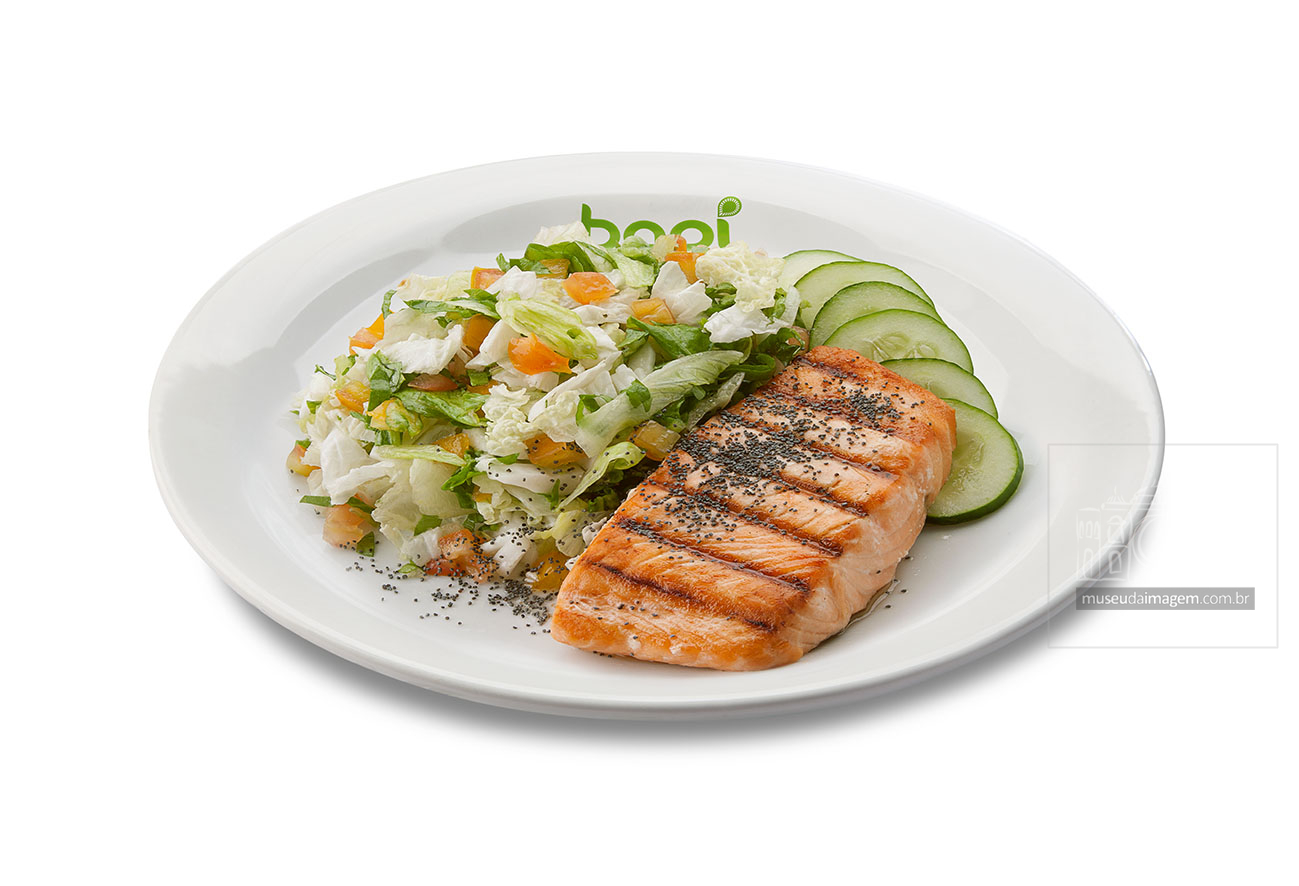 Bapi Marina, Salmão grelhado, acelga, rúcula, tomate, alface, pepino japonês, azeitona, molho italiano e