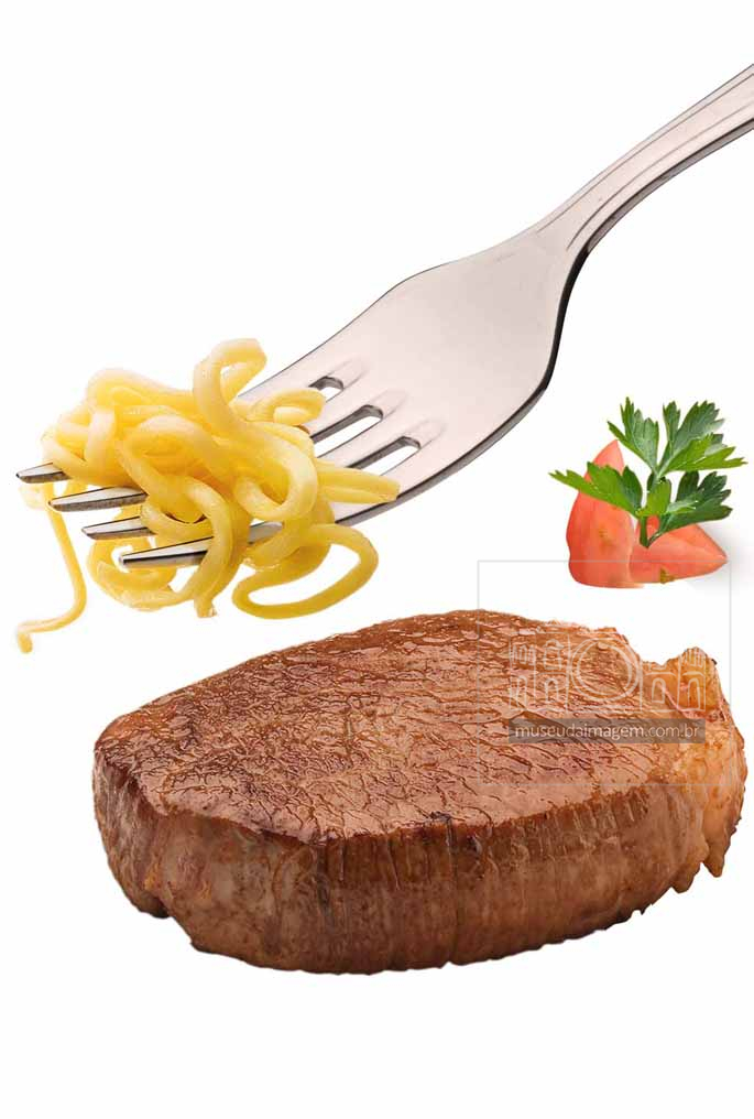 garfo, carne, macarrão